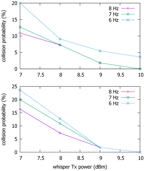 Let denote the distance between the BSM sender and the receiver at which the collision probability is less than 5%. In (a), the message reception is possible at distances at 9 dBm and 7 or 8 Hz. In (b), all three messaging rates qualify at 9 dBm. For this reason, we will assume in the rest of this paper that the whisper Tx power is set to 9 dBm, and the whispering frequency to 7 Hz. Note that these numbers are only used as rough guidelines to demonstrate the potential of the proposed approach. If need be, they will be refined in future work.