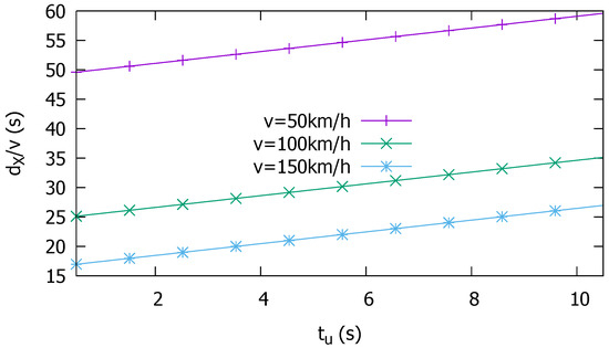 where is the speed of the given vehicle. The threshold is essentially the credit that a roadside attacker can maximally accumulate at V while V travels a distance at v, or equivalently, during seconds. Here, is the maximum distance that a vehicle can use the same whisper ID, as in Equation (1). To show how long a neighbor vehicle should travel with a host vehicle to be considered credible, Figure 5 plots as a function of and v for m.