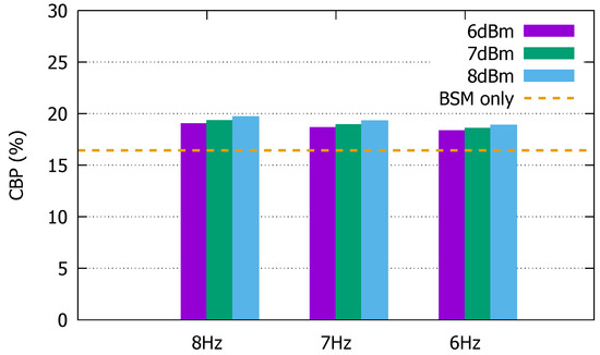 Additional whispering activity inevitably increases channel utilization. If excessive, it could even jeopardize the more important safety message exchanges such as BSM. So, we also measure the channel used in the simulation to check on this possibility. Figure 8 shows the channel busy percentage (CBP) as a result of using whispers. We notice that the increase in CBP remains at 2% to 3% in each of the considered variations of Tx power and frequency. Even if the whisper messaging rate is 60% to 80% of the BSM beaconing rate, the increase in CBP is not as significant due to the smaller power at which the whisper messages are transmitted. So, the low-power beaconing scheme only slightly increases the CBP, and it can be done without excessively disturbing the ordinary beacon exchanges.