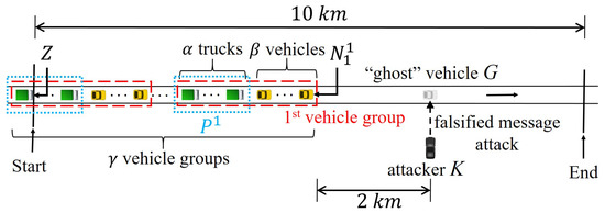 We assume that all platoon vehicles try to keep their speed at 80 km/h. In contrast, non-platoon vehicles can use higher speeds when it wants to close the gap with a preceding vehicle. The maximum acceleration and deceleration of both types of vehicles are assumed to be 3 m/s and m/s, respectively [41]. All vehicles can use their sensors to detect the obstacles within 150 m of the line-of-sight (LoS). Notice that has no obstruction in front, so it can easily recognize obstacles in the front. However, the front view of its followers are blocked by the preceding vehicles, making it difficult to detect obstacles. An attacker K is situated at from the roadside. Although a very remote attacker can be more easily rejected as explained above, by putting the attacker within the hearing range of the whisper, we want to stress-test the proposed scheme. K broadcasts forged messages announcing a ghost vehicle G, which is not actually present, at a distance of 2 km ahead of . K continuously broadcasts forged messages, causing the vehicles to brake when the vehicle groups come in the range of its BSM transmission.