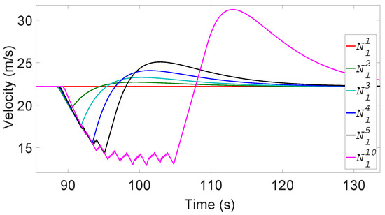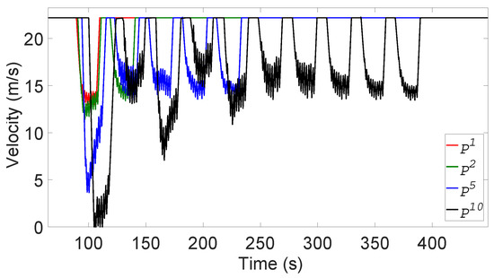 The velocity fluctuation in the non-platoon vehicles directly affects the immediately following platoon vehicles. The leader of the platoon that immediately follows has to slow down due to the attack and then increases its speed to the original speed only after its other sensors check the absence of G. However, unlike the non-platoon vehicles, the platoon members of are controlled by the leader, so at the command of the leader, they move at the same speed. Recollect that the platoon members are prohibited from accelerating to more than 80 km/h. The other platoons experience similar dynamics. Furthermore, the speed of decreases more than that of as the effect accumulates. Figure 12 shows the velocity changes of some of the platoons. In general, suffers i episodes of significant velocity fluctuation due to the remote attack. We observe that the latter platoons, most notably , suffer from elongated and repeated instability.