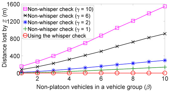 Using the whisper check can drastically reduce the undesirable impacts of the remote forged position attack such as exposed by Figure 11 and Figure 12. Figure 13 sheds light on these impacts of whisper checks from yet another angle, the distance loss. In particular, it shows the distance lost by the last vehicle Z compared with the case in which vehicles employ the whisper checks, under various values of and and . We fix the value of because the platoon followers travel at the same speed as the platoon leader and had little effect on the velocity change of Z. When all vehicles use the whisper check, Z travels 10 km at a velocity of 80 km/h without any distance loss, regardless of and values, because the vehicles successfully filtered out forged messages. In contrast, in the absence of the whisper check, the average velocity of Z decreases as and increase, and there is lost distance. For instance, for , the average velocity of Z while moving 10 km dropped to about 52 km/h, far below 80 km/h with the whisper check in play.