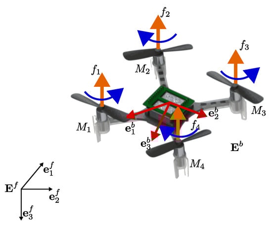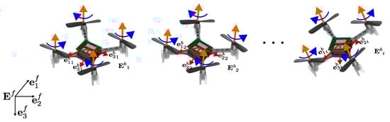where is the mass of the ith quadcopter and its inertial matrix expressed in . g is the mass acceleration and . denotes the position of the vehicle’s center of mass, which coincides with the origin of frame with respect to frame . is its linear velocity in , and the angular velocity vector of the body coordinate frame relative to the inertial coordinate frame expressed in . The input represents the couples generated by the actuators, aerodynamic couples and external couples (environmental forces). It is typically assumed that these torques are only generated by actuators. The positive scalar denotes the ith vehicle’s total thrust applied to the airframe by the four rotors in the direction of .