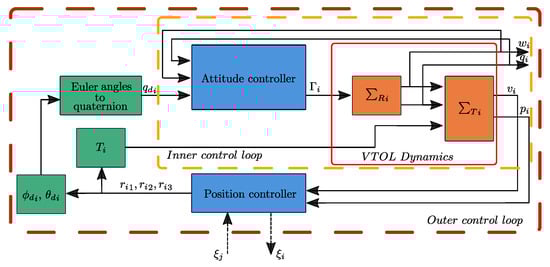 Note that (8) and (9) constitute a cascade system. For each VTOL-UAV i, with , in (8) represents the translational dynamics which depends on , whereas in (9) represents the rotational dynamics which does not depend on . Consequently, will be independently designed in a first step.