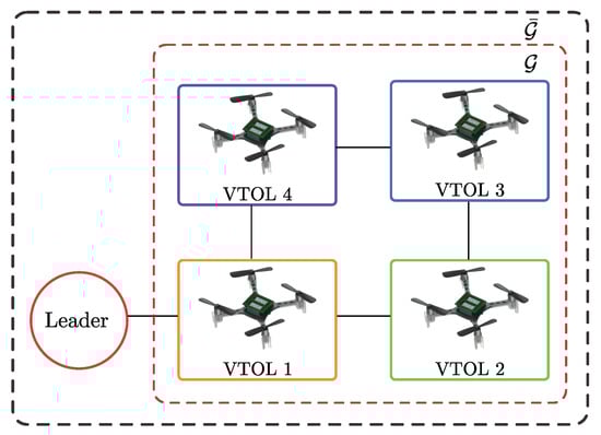 Cyber-physical systems (CPSs) integrate computer-based functions, like computing and networking, with physical components. In these systems, software and hardware are deeply interconnected. Each section operates at different spatial and temporal scales with different and multiple behaviors, interacting with each other in many ways that change with context. CPSs cooperate, self-organize, act on their environment, etc., …, making autonomous decisions. The applications include transportation systems, automation, security, smart cities, medical monitoring, agriculture, military operations, process control, or robotics []. A special collection of CPSs is the cyber-physical vehicle systems (CPVSs), which comprise terrestrial, underwater, and flying vehicles [,,,]. Among CPVSs, unmanned flying multi-vehicles are of interest in the industrial and the academic field. A focus has notably been given to the problem of agreement (consensus) and the formation of micro aerial vehicles with capabilities of vertical take-off and landing, so-called VTOL-UAV [,,]. In this case, cooperative distributed control strategies are exciting, and the robotic and control community have developed a set of charming policies and proposals for large-scale multi-agent issues. The primary motivation behind this effort is that a set of organized vehicles is likely able to outperform an individual or sparse systems operating separately [,,,].