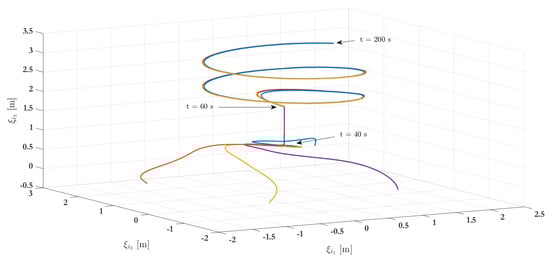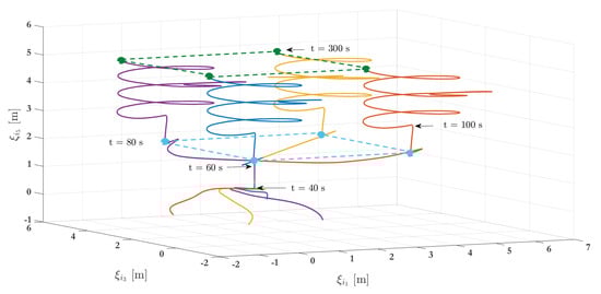 The numerical simulation results of the second scenario addresses five arrangements integrated by four agents for 300 s. The complete maneuver in the 3D-space is depicted in Figure 8. As with the simulation for Scenario 1, the UAVs start from the initial condition depicted in Table 1. Then, the leader-following consensus protocol (27) is executed, being the virtual leader position, i.e., the reference point for the followers. Once the consensus has been obtained at the fixed reference point (which is achieved at t = 40 s), the virtual leader switches to and the consensus is achieved at s. Then, the control switches, and the leader-following formation protocol (46) is performed using an associate target location set , as the formation specification, given by