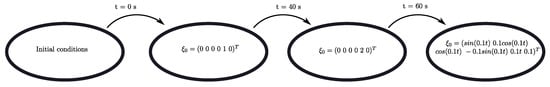 where is the state vector for the ith VTOL-UAV, is its control input, and . Note that the pair is stabilizable. Furthermore, let us define the virtual leader’s dynamics, which is labeled 0 as follows: