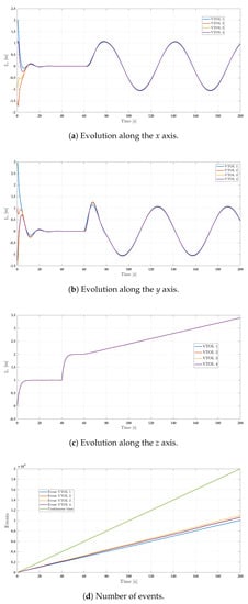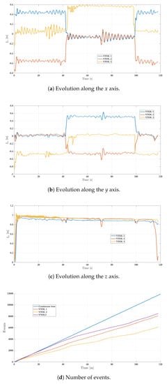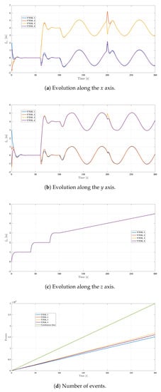 Figure 10a–c show the positions’ evolution of each agent for the second scenario. The simulation also sets an external perturbation on VTOL 1 at 200 s. Figure 10d exhibits the number of events for all agents. The plot also shows a continuous-time transmission among agents. Considering a sampling rate of 0.01 s during transmission and a simulation time of 300 s, there is a total of 30,000 events for each agent in the periodic case. In comparison, the event-based control strategy generates only 15,310 events for VTOL 1, 16,180 for VTOL 2, 16,780 for VTOL 3 and finally 16,210 for VTOL 4. This represents a reduction of about 51.03%, 53.93%, 55.93%, and 54.03% respectively in the transmissions. A video of this scenario can be viewed in the following link: Video of Scenario 2 (https://www.dropbox.com/s/jfuh058b5v33njb/Formacion_MDPI_2019.mp4?dl=0).