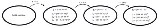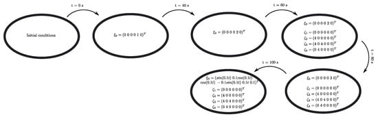The numerical simulation results of the first scenario addresses three arrangements integrated by four agents for 200 s. Figure 5 shows the position of all agents in a 3D representation, where the vehicles trajectories are highlighted in the plot (in dot line) and the time when all agents achieve the different stages is also depicted. The initial attitude and position for each vehicle are depicted in Table 1, with zero angular and linear velocities. In this simulation, the UAVs start from initial condition, and the leader-following consensus protocol (27) is executed being the virtual leader position, i.e., the reference point for the followers. Once the consensus has been obtained at the fixed reference point (which is achieved at t = 40 s), the virtual leader switches to be and the consensus is achieved at s. Then, is parameterized in time as for s. Meanwhile, the consensus protocol (27) continues to be executed. Figure 6 shows the three main phases during the simulation.