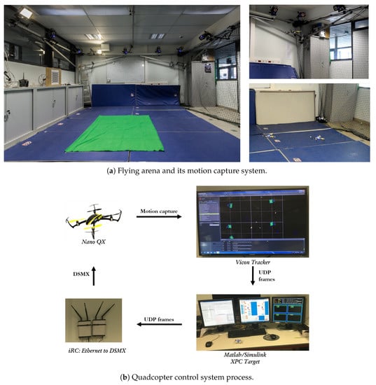 The proposed control strategy has been verified in practice through a set of experiments. The selected vehicles are Nano QX quadcopters, whose on-board computer were modified to execute the control strategies. The attitude control for the quadcopter is implemented in an embedded system, which holds rate gyros and accelerometers for attitude estimation. Next, a ground station receives the position and estimates the velocity of the quadcopter utilizing a Vicon Tracker system and twelve cameras in the so-called MOCA flying arena at GIPSA-lab laboratory (see Figure 11a). The control strategy is implemented in real-time at 200 Hz on a computer using xPC target toolbox. The control signal is sent back to each quadcopter through a GIPSA-lab’s built-in bridge that converts UDP frames to Bluetooth or DSM2 protocol (see Figure 11b).