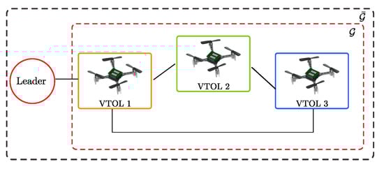 A collection of experiments are conducted to assess the performance of the proposed consensus and formation control. The tuning parameters and saturation for control law (11) are chosen to match with the actuators and vehicle characteristics. For the experiment, three agents are employed, each one being a nano quadcopter. The communication topology in the collaborative system is implemented via the graph illustrated in Figure 12, where VTOL 1 is the only agent that receives information from the virtual leader. The real-time implementation is performed for 120 s with a sampling time of 0.01 s.