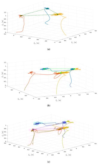 Experimental results: 3D representation. (a) Formation shapes described by the associate target location set and achieved at s; (b) Formation shapes described by the associate target location set and achieved at s; (c) One more time, formation shapes described by the associate target location set and achieved at s.