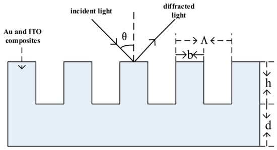 In this paper, the structure of a sensor using a gold and indium tin oxide (Au/ITO) nanocomposite is presented. As shown in Figure 1, among the grating structures: grating depth h = 35 nm; grating width b = 180 nm; grating period Λ = 1000 nm; nanocomposite grating substrate thickness d = 285 nm; duty cycle Ω = 0.82. The sensor production process is: pyrex glass deposition of 40 nm armor grease polymethyl methacrylate (PMMA) is executed to form a corrosion-resistant layer, on the corrosion layer with uniform glue machine spin 300 nm Au/ITO hybrid composites of colloid particles. After drying in pure nitrogen, a sensing membrane that is sensitive to the solution being tested and capable of identifying the substance being tested was modified. After washing away unbound material, the substance was placed in a 4 °C refrigerator for 12 h. Plasmon dry etching with 300 nm Au/ITO nanocomposites was performed up to a depth of 35 nm, as shown in Figure 1. Raster layer was 285 nm subwavelength grating structure, as a sensor is sensitive to the chip. Among nano-structured particles, Au nano-structured particles have good characteristics such as large specific surface area, strong corrosion resistance, oxidation resistance and chemical inertness, and good stability. ITO is a low refractive-index medium. This paper uses Au/ITO nanocomposite materials instead of traditional metal materials. Under a certain fixed angle of polarized light, the dielectric constant of the nanocomposite materials is controlled by adjusting the volume ratio of Au to ITO. The SPR resonance output of this nanocomposite layer has two resonance peaks, namely, the long-range surface plasmon resonance peak (peak 1) and the short-range surface plasmon resonance peak (peak 2). The wavelength of peak 1 produces a corresponding drift with changes in the refractive index of the test medium. The wavelength of peak 2 does not drift with changes in the refractive index of the test medium and only depends on the wavelength of the incident light, the incident angle, and the dielectric constant of the composite material layer. Au/ITO nanocomposite-based SPR sensors not only have high sensitivity and precision but also provide a peak wavelength that does not change with the refractive index of the test medium and short reference resonance peak drift. Moreover, the reference peak can reduce the effect of the incident light angle drifts on the measured results.