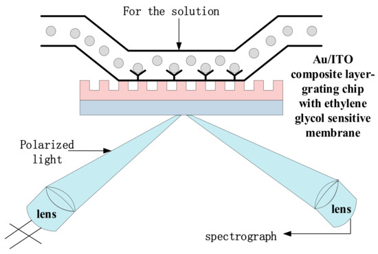 As shown in Figure 2, the corresponding sensing membrane is fixed to the grating surface, and the solution under test flows through the grating chip. The analyte and sensor membrane have binding specificity and form a complex under certain conditions. The analyte is not filled in the grating gaps, and just a layer of analyte is tiled on the surface of the grating for binding to the sample. The process takes only a few seconds to complete. The combination of antigen and antibody can cause mass changes on the surface of the sensor. As the refractive index of the diffracted light is proportional to the change in mass, the refractive index changes accordingly. The relationship between the incident wavelength and the refractive index of the medium is presented by the sensor mechanism. When P-polarized light enters the diffraction grating through the flow channel, the surface biomolecule recognition element is adsorbed on the grating, which can capture specific analyte molecules, causing the refractive index of the surface on the grating to change and the resonance angle in the reflection spectrum to shift. The functional relationship between the angular offset and the properties of the measured sample is used to analyze the characteristics of the sample.