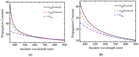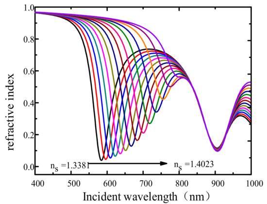 As shown in Figure 3a, the Kinc curve of the propagation constant of incident light and the two curves of the propagation constant of the plasmon wave Ksp show an intersection point, that is, the propagation constant of incident light at different wavelengths is equal to the propagation constant of the plasmon wave at the two interfaces. Therefore, resonance can be excited at the interface between the composite layer of the diffraction grating and the dielectric layer to be measured. Two resonance peaks are present in the reflection spectrum, one of which is related to the refractive index of the medium to be measured; the other peak is only related to the wavelength of the incident light, the incident angle, and the dielectric constant of the composite layer. When Au/ITO nanocomposites replace the metal layer, the wave vector of the plasmon wave at the interface of the metal layer changes due to the characteristic of the dielectric constant of the composite material, and the sensor’s reflection spectrum shows two resonance peaks. As shown in Figure 3b, when the metal material is gold, the curve of the propagation constant Kinc of incident light and the curve of the propagation constant Ksp of the plasma wave at the interface between the composite material layer and the dielectric layer to be measured have only one intersection. This means that the wave vector of incident light can only excite the surface plasmon resonance of the interface between the gold layer and the dielectric layer to be measured. Thus, the reflection spectrum has only one resonance peak related to the refractive index of the dielectric to be measured.