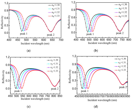 Reflectance spectra of different refractive indices of the medium to be tested (nanocomposite layer thickness d = 40 nm). (a) volume fraction f = 0.55, (b) volume fraction f = 0.65, (c) volume fraction f = 0.75, and (d) volume fraction f = 0.85.