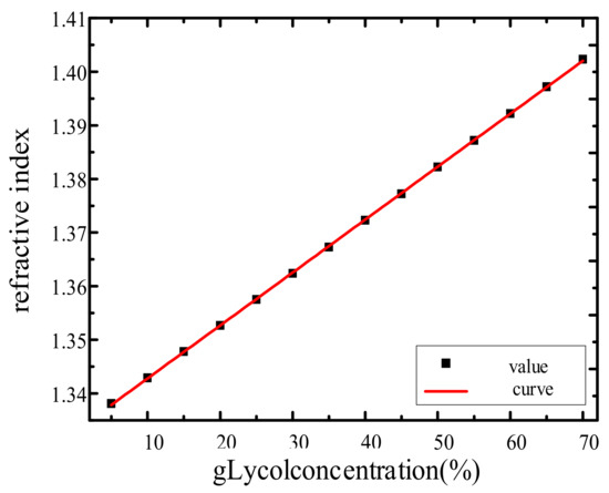 Using the data in Table 1, the fitting curve of the relationship between glycol concentration and refractive index was obtained. As shown in Figure 5, the refractive index equation is n = 1.33293 + 0.09872c, and the correlation coefficient of the fitting equation is 0.999995 which is extremely closed to 1. Therefore, we can see that the fitting effect is very good, which means that the concentration and refractive index have a strong linear relationship.