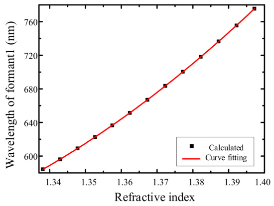 When determining the relation between the solution refractive index and the wavelength of reflectivity dip 1, a large error occurs during linear fitting. Thus, quadratic polynomial non-linear fitting is adopted to obtain the relation between the wavelength and the refractive index, as shown in Equation (3):