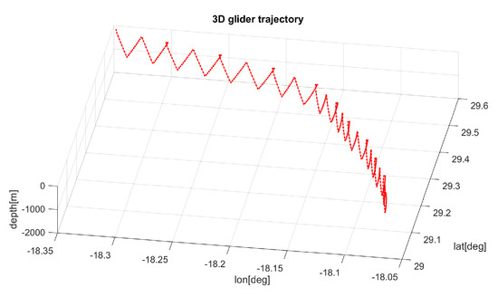 The glider control configuration was set to include 10 stints composed by two yo-yo’s each, defining the inflection range of a maximum depth of 1060 m and a minimum of 10 m. The vehicle was commanded to stay at the surface for 20 min before the next dive. The nominal velocities were configured to model the performance of the Slocum G2 glider, also incorporating some manoeuvrability restrictions. Figure 1 shows an example of 3D glider trajectory, illustrating the vehicle inflections, surface drifting, and tidal-current effects.