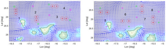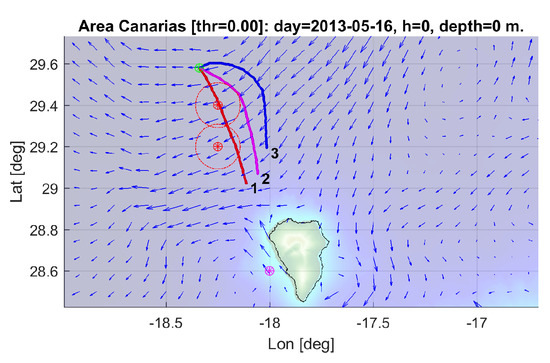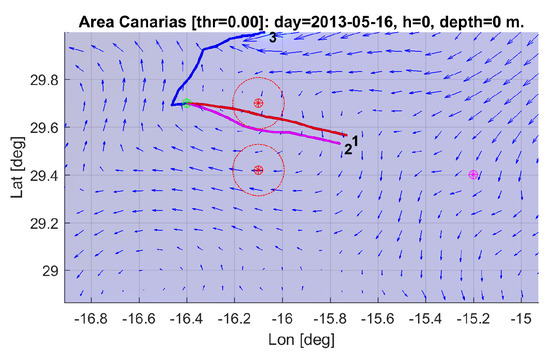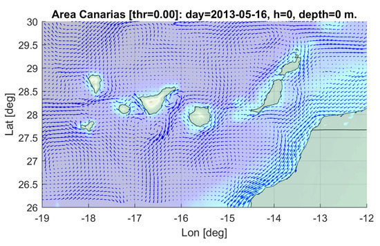The Canary Islands sea area was selected for the simulation, due to the special characteristics found in this zone, with the presence of a great variety of oceanographic structures of interest (eddies, upwelling cells, fronts, etc.). The area covered from −12 to −19 East and 26 to 30 North, between 16 and 18 May 2013, a period showing highly dynamic ocean currents, as can be observed in Figure 2.