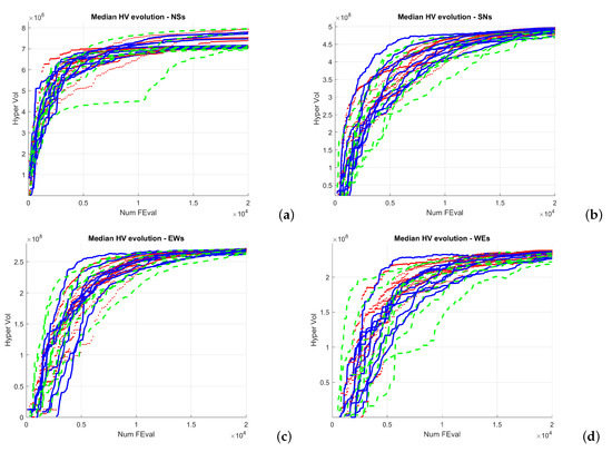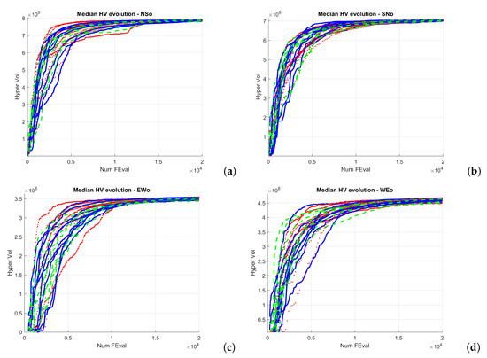 Hypervolume (HV) median convergence for scenarios 1–4 after 20,000 executions fitness evaluations (FES): (a) Scenario 1 (N–S); (b) Scenario 2 (S–N); (c) Scenario 3 (E–W); (d) Scenario 4 (W–E).