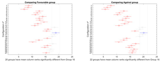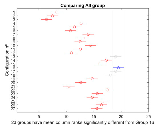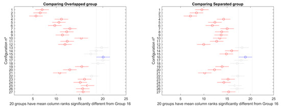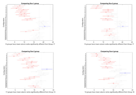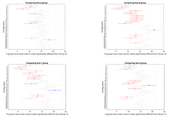 Specific scenario analysis—e.g., scenarios 1 and 8 in this paper—could be performed to select the most convenient configuration depending on the particular environmental characteristics, instead of applying the global solution. The results of the post-hoc procedures indicate that there is evidence of statistically significant advantages among the different configurations. Particularly, compared to Bonferroni’s the more powerful Bergmann–Hommel procedure is able to identify a higher number of cases surpassed by the best performing combination; 9 more cases in scenario 1 (Table 6 and Table 7) and 12 in scenario 8 (Table 9 and Table 10).
