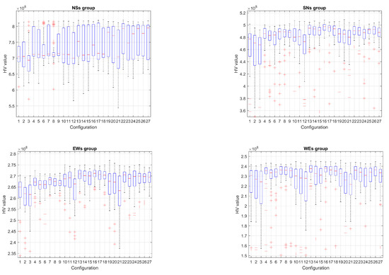 Considering all the configurations of both cases, configuration 16 (PS 100, NG 200, CP 1, MP 0.15) provided the best global results, closely followed by 13 (PS 100, NG 200, CP 1.0, MP 0.10) and 17 (PS 100, NG 200, CP 0.9, MP 0.15) (Figure 22). The population size of 100 is a good balance for exploration–exploitation equilibrium of the search in these 10 variable tested scenarios. It provides a faster convergence than the 160 population size case, while a highly elitist algorithm as NSGA-II favours a high crossover rate (1.0) and slightly higher mutation rate (0.15) than the general rule 1/n (0.1), enhancing the population diversity by those operators. Second and third configurations also keep either the crossover rate of 1.0 with mutation rate of 0.1 or a slightly lower crossover rate (0.9) with mutation rate of (0.15), confirming the appropriateness of the operators.