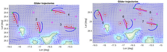 To test this system and its robustness, a set of eight scenarios was defined around the islands. Each scenario, as shown in Figure 3, consist in a start location (green), two obstacles with a safety ratio (red), and a target location (purple). The factors considered were the ocean currents average direction (favourable/against) and variability (stable/unstable), obstacle configuration (overlapping/separated), and bathymetric restrictions.