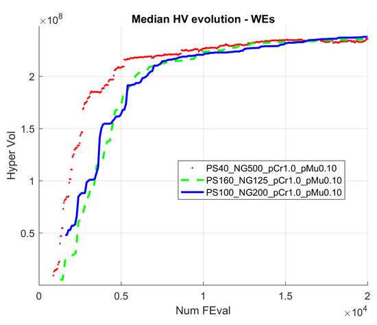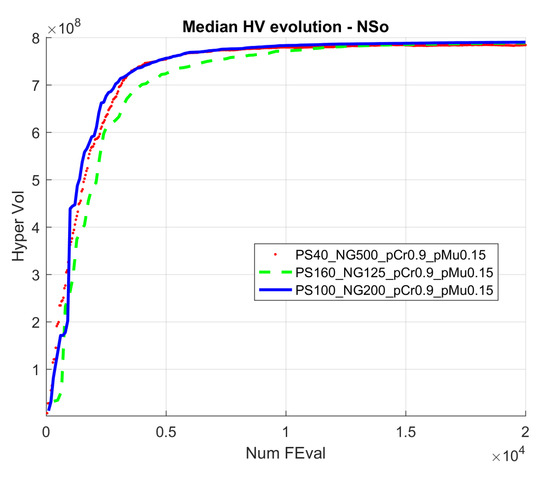 A total of 27 different configurations were considered for the NSGA-II, combining three values of mutation probability (0.05, 0.1, 0.15) around the rule [57], with n = 10 in our case, and crossover probability (1, 0.9, 0.8), with population size (40, 100, and 160) for 500, 200, and 125 generations, respectively. To guarantee a fair comparison, the same total number of 20,000 fitness evaluations (FES) was set as stopping criterion. All parameter value combinations are presented in Table 3.