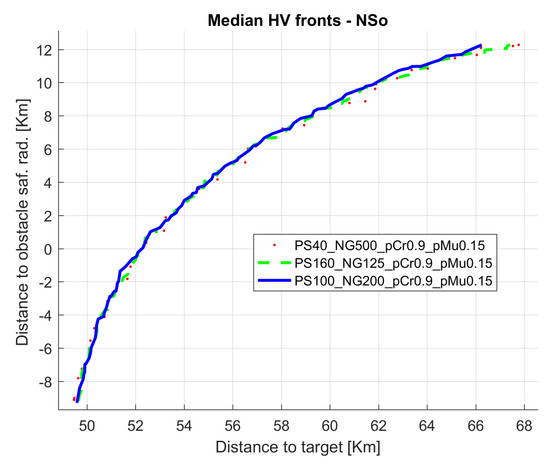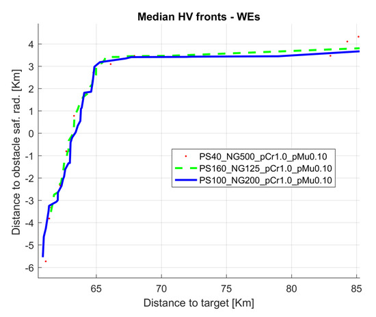Figure 5 and Figure 6 show the evolution of the Hypervolume for the median execution of every 27 configurations, for overlapping and separated obstacles scenarios, respectively. The reference points used for HV computation were 10 km and 90 km (80 km for scenarios 6 and 8).