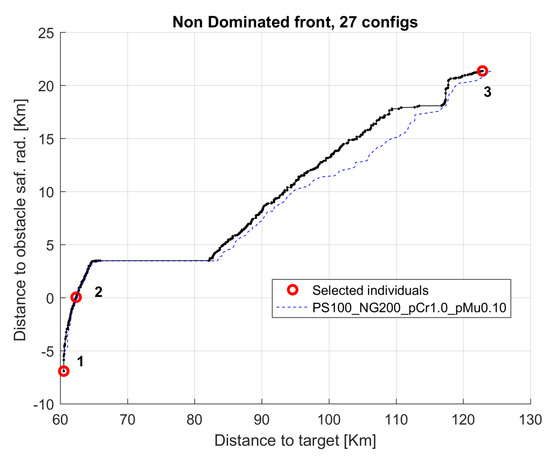 The proposed methodology was able to produce satisfactory trajectories using the genetic algorithm NSGA-II. It is worth mentioning that the optimizations include well spread solutions that go from one extreme to another. This means that solutions include results that, in this case, crossed the safety radius to obtain a better distance to target point (through a straight line) or move away from the safety radius, increasing safety at the expense of worse target distances.