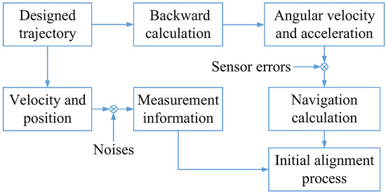 Firstly, the simulation is given as follows. Through the designed trajectory of the carrier, the outputs of the gyroscope and accelerometer with errors could be obtained according to their mathematic models. In addition, by adding errors into the true velocity and position of the trajectory, the measurements for initial alignment were built as the output of a virtual GPS receiver. The simulation process can be summarized as the following block diagram which is shown in Figure 2.