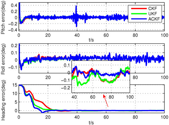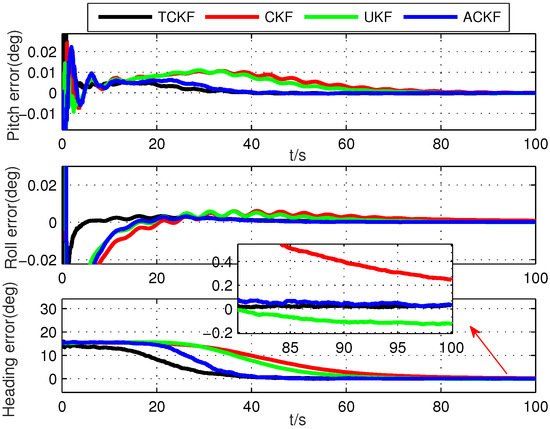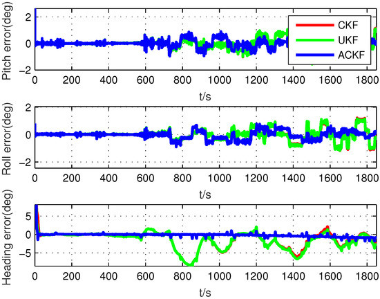 From the results of simulation, it can be seen from Figure 3 that the proposed ACKF had better alignment accuracy than the existing CKF and UKF, and its alignment error was close to the error from TCKF. This was because the proposed ACKF could adaptively estimate and and eliminate the influence of the inaccurate noise covariance information. It also can be seen from Figure 4 that the proposed ACKF had smaller SRNFNs than the existing CKF and UKF. In the conventional Kalman filter, represents the predicted error based on the measurement information . Due to the inaccurate noise covariance matrices of the state and measurement, the conventional filters relied on the wrong information. Thus, the convergence speed and estimation accuracy of CKF and UKF were lower than those of TCKF and ACKF.