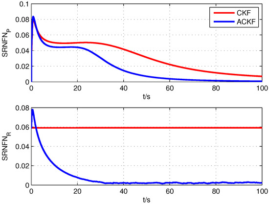 Based on the parameters in Table 1, the nominal state noise covariance matrix was set as . The nominal measurement noise covariance matrix was set as . Considering that the true was always larger than the nominal value due to the external disturbance such as vibration and the slowly time varying characteristic, the true was set as , where denotes the simulation time. The true was set as . Existing UKF [18], CKF [14], the Sage–Husa adaptive Kalman filter (SHKF) [26], and CKF with true noise covariance matrices (TCKF) were selected to compare the performance with the proposed ACKF method. For the proposed ACKF, the tuning parameter, forgetting factor, and iteration number were set as , , and , respectively. The initial state was set as . The initial state error covariance matrix was set as . The frequency of measurement updating was set as 10 Hz. The total number of Monte Carlo runs was set as . Furthermore, to evaluate the estimation accuracy of and , the square root of normalized Frobenius norm (SRNFN) was used, which is defined as follows: