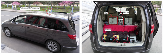 Secondly, a vehicle experiment was performed to validate the performance of the proposed ACKF method in practice. The photonics inertial navigation system (PHINS) produced by the company IXSEA France, a self-made SINS, and the antenna of GPS receiver were mounted on the car as shown in Figure 5.