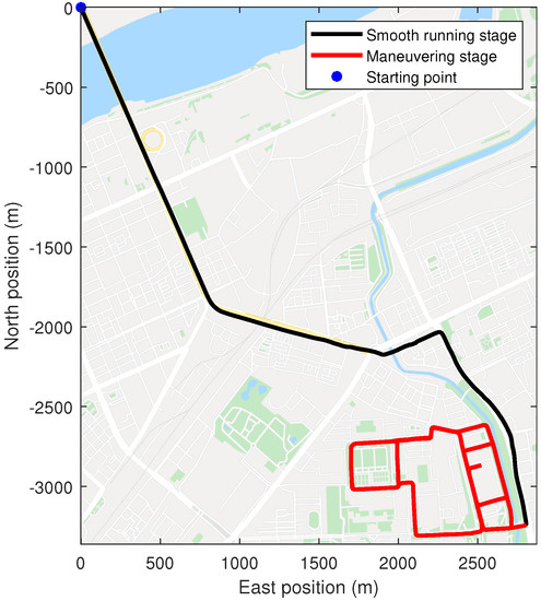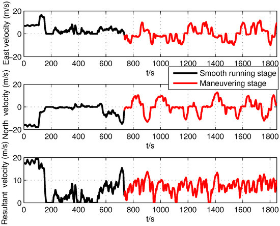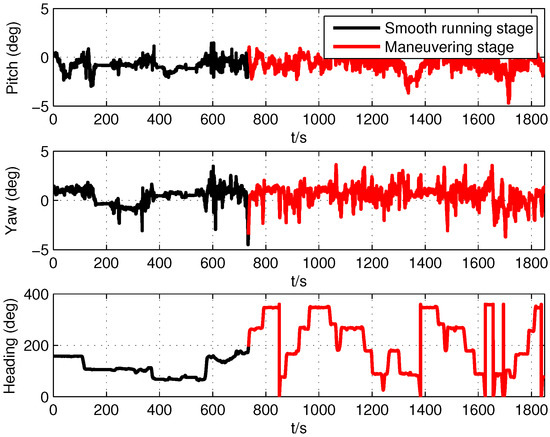 The self-made SINS had a three axis fiber optic gyroscope and accelerometer to measure body angular rate and specific force, respectively. The theoretical sensor specifications of SINS were the same as the simulation in Table 1. The GPS receiver could provide position and Doppler derived velocity measurements to carry out initial alignment and integrate with PHINS to constitute a high accuracy attitude reference system for SINS. The lever arm and the installation error angles between SINS and PHINS were compensated. The output frequency of SINS and PHINS/GPS integrated navigation system were 100 Hz and 10 Hz, respectively. The root mean square of the attitude accuracy of the PHINS/GPS integrated navigation system was for roll and pitch angles and for the heading angle. Because of the uncertainty of the sensor parameters of SINS and the influence of external disturbance in motion conditions, we could not obtain the accurate sensor parameters, which determined the state noise covariance values in the Kalman filter. Therefore, the theoretical sensor parameters were nominal and inaccurate in the practical environment. The experiment was carried out in an urban area (45.776, 126.446), and the running stage continued for 1850 s, including two parts: smooth running stage (0 s to 735 s) and maneuvering stage (735 s to 1850 s). The running trajectory, attitude, and velocity of the car provided by the PHINS/GPS integrated navigation system are shown in Figure 6, Figure 7 and Figure 8, respectively. It can be seen that the car had frequent turn movements in the severe maneuvering stage, which would subsequently induce the uncertain sensor parameters of SINS. Therefore, the data of this running stage could better verify the effectiveness of the proposed ACKF method.