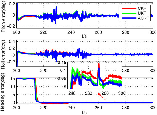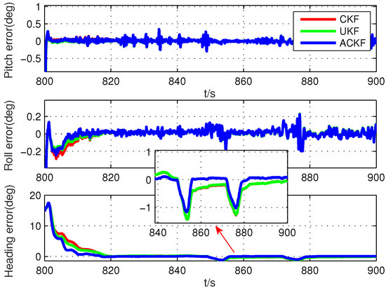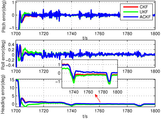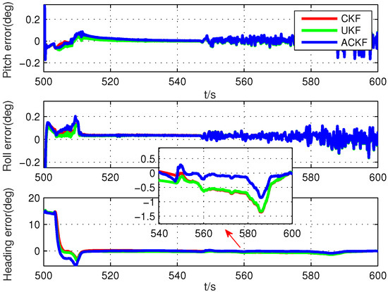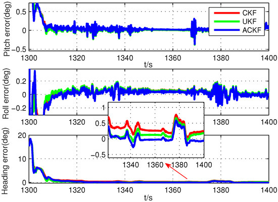 Normally, the initial attitude matrix of SINS was set as the identity matrix. However, this may not induce the large misalignment angles sometimes. Therefore, the additional large misalignment angles, which were set as , were added into the reference initial attitude matrix of PHINS/GPS integrated navigation system to make up the initial attitude matrix of SINS. The nominal state noise covariance matrix and nominal measurement noise covariance matrix were set the same as the simulation. The tuning parameter, forgetting factor, and iteration number were set as , , and , respectively. Firstly, to compare the performance of the proposed ACKF and the existing methods, we used the whole data to simulate the initial alignment process. Because the true noise covariance matrices were unknown in the practical environment, the calibration results of SINS as shown in Table 1 were selected as the parameters of the filters. The alignment errors of these methods are shown in Figure 9. From the results of the experiment, it can be seen that the performances of ACKF, UKF, and CKF were similar in the smooth running stage, which was because the preset nominal values were close to the true values for the high accuracy SINS. However, in the maneuvering stage, the performances of UKF and CKF were worse than the proposed ACKF, especially the heading angle error, which is because the noise covariance matrices were changing when the carrier was maneuvering, which had a severe influence on the alignment accuracy.