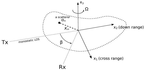 Figure 1 shows the geometry for the problem of bistatic radar tomographic imaging under consideration. The transmitter Tx and receiver Rx are located in the far field of the target of interest. The bistatic angle between the transmitter and receiver with respect to the target is denoted as . The transmitter is narrowband, transmitting a continuous waveform at a single frequency f (i.e., the wavelength is , where c is the speed of signal propagation). A local target coordinate frame , which is fixed and rotated with the target, is chosen as the reference frame. Here, both the transmitter and receiver lie on the image plane of the target, and the origin of the frame is placed at the target rotation centre. It is also assumed that the target rotational speed Ω is constant over the coherent processing interval (CPI) and is accurately estimated a priori.