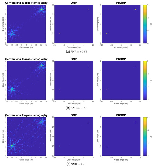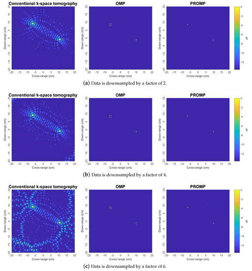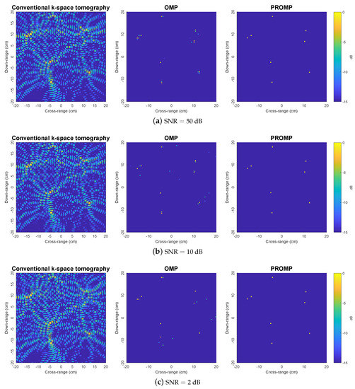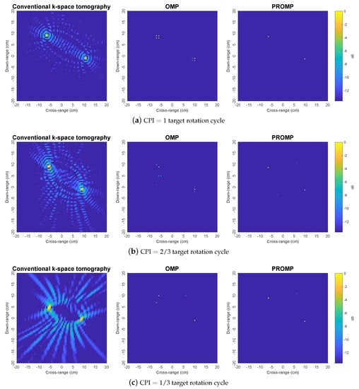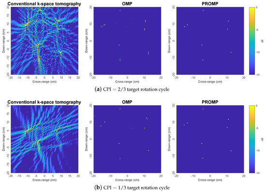 To further demonstrate the superior performance of PROMP, the reconstructed images obtained from less data samples (i.e., with and target rotation cycle) are shown in Figure 5. With a limited number of data samples, the k-space method results in unsatisfactory images with incorrect peaks, while OMP and PROMP are observed to retain their good performance. In addition, similar to the observations in Figure 4, PROMP outperforms OMP and provides a better image of the target thanks to its ability to deal with off-grid scatterers.