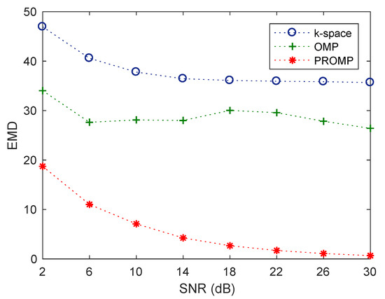 We now compare the performance of the k-space, OMP, and PROMP methods using the earth mover’s distance (EMD) between the true and reconstructed images. EMD [40] is a widely-used metric to compare the similarity between different images. In principle, EMD is an estimate of the distance between two distributions which is equivalent to the minimal amount of work required for one distribution to be transformed to the other [40]. Figure 6 shows the EMD performance of the k-space, OMP, and PROMP methods, averaged from 1000 Monte Carlo runs, against various levels of SNR for the synthetic target 2 and target rotation cycle. We observe that the PROMP method exhibits an EMD much smaller than those of the k-space and OMP methods. This indicates that, from a statistical point of view, the image obtained by PROMP is much closer to the ground-truth image than those obtained by the k-space and OMP methods, thus verifying the performance superiority of the PROMP method.