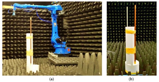 Photos of experimental system configuration: (a) an antenna mounted on a robotic arm, and (b) two vertical metallic rods secured to a rotating pedestal.
