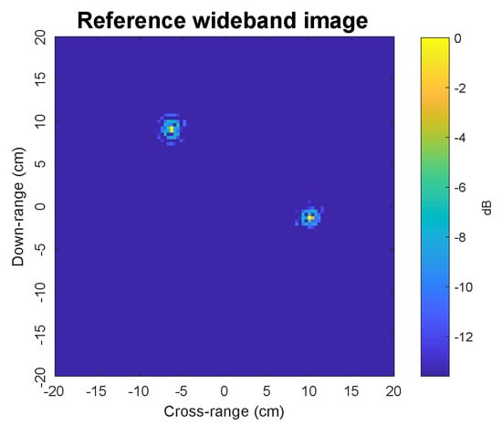 A benchmark experimental target image using wideband signals received by the monostatic receiver for all 101 frequency steps between 8 GHz and 12 GHz.