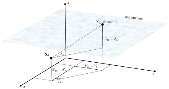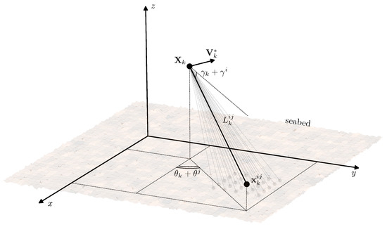 In detail, the model of acoustic measurements is presented in Figure 3. Let , be the set of aiming angles at which the sensors of the AUV emit the acoustic beams and acquire the distance to the seabed. These angles are defined with respect to the AUV attitude, which means that the absolute beam direction is given by the angles . Thus the coordinates of the point , where the beam reaches the seabed at the time instant are expressed as: