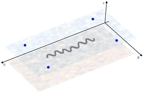 In this simulation, it is assumed that on the sea surface there is a set of four sources of acoustic signals (beacons) with known coordinates , : , , , . These coordinates are chosen so that the situation of the bearing angles , close to would not be possible and there would be no need in the regularization of the observations in Equation (17). The beacons’ positions with respect to the AUV nominal path are shown in Figure 5. Note that despite the fact that in all the previous considerations a single beacon was assumed, the transition to the multiple observations case is rather obvious and requires only vertical stacking of correspondent values in the original Equations (17) and (18) and pseudo-measurements of Equations (19) and (20).
