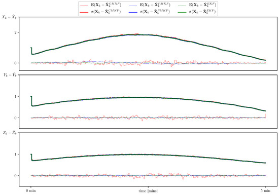 In Figure 7, we show sample paths of the system for three mentioned state estimators and the nominal trajectory which they intended to follow. In Figure 8, we show the estimate error mean and standard deviation calculated on the set of sample paths.
