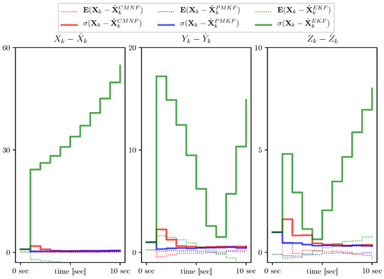 This, nevertheless, can not serve as a justification for the EKF supreme applicability. In Figure 9, we present the results for the same setting, but with one beacon moved closer to the AUV starting position , namely and for a shorter time period equal to 10 s. In this situation the linearization errors play more significant role and hence the EKF demonstrates divergence, while the other two filters remain stable.