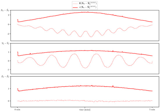 The introduction of , which is called pseudo-measurements, is a common method of nonlinear systems analysis [21,25]. The idea is based on the fact that linear Kalman filtering estimate is the linear-optimal one in the case of linear observations and system dynamics and on the assumption that the noise covariance, even being state-dependent, may be evaluated or replaced by an upper bound. In our previous work [26] the filtering algorithm based on the pseudo-measurements has been suggested and its recurrence relations has been derived from the assumption of the unbiasedness of the estimate on the previous step. As applied to the problem at hand these relations are as follows: