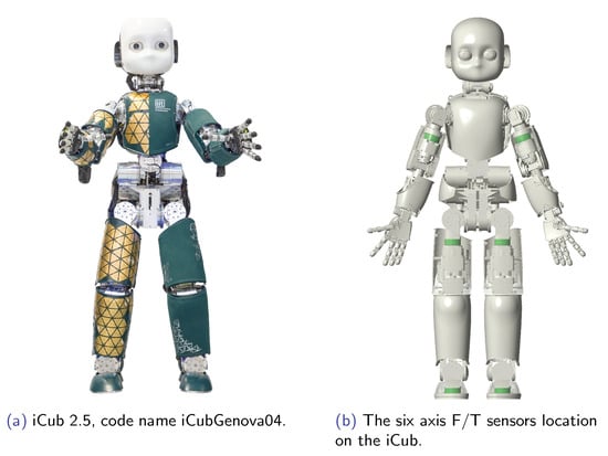 - Fumagalli, M.; Randazzo, M.; Nori, F.; Natale, L.; Metta, G.; Sandini, G. Exploiting proximal F/T measurements for the iCub active compliance. In Proceedings of the 2010 IEEE/RSJ International Conference on Intelligent Robots and Systems (IROS), Taipei, Taiwan, 18–22 October 2010; pp. 1870–1876. [Google Scholar] [CrossRef]