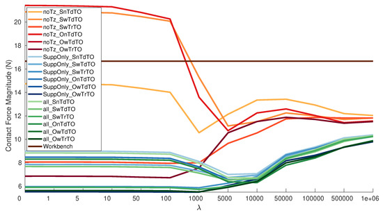 Average magnitude of the contact force using only estimated calibration matrices.