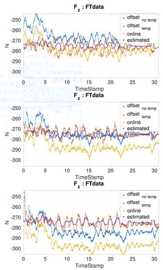 Ex situ calibration is usually performed using specialized structures [1,21,22,23] or relying on previously calibrated sensors [24,25,26,27]. The latter has the disadvantage of trusting on the calibration of another sensor which might not be perfect. The in situ methods allow to perform the calibration in the sensor’s final destination, avoiding the decreases in performance that arise from mounting and removing the sensors from its working structure. Some in situ calibration methods have relied on other FT sensors [27,28]. Others exploit known relationships between some quantities such as joint torques [29] or acceleration measurements [10] to obtain the reference forces. Some calibrate the sensor mounted in their final position by designing a calibration bench that accommodates the sensor and the mounted structure [30]. This requires the design of a particular structure and the mounting and dismounting of the whole part to calibrate one sensor. Six-dimensional force/torque sensors can be calibrated based on the shape from motion method with complex algorithm. This requires the use of thre different sets of weights and a minimal setup with a fixed pulley. It requires a calibration of the sensor three times per load, so in total, nine datasets [31]. In all of these methods, the effect of temperature is either not considered or carefully controlled when calibrating without accounting for changes in the working conditions. Other methods exploit the encoders and the model of the robot to provide the reference forces and torques [11]. This method was successfully improved to account for temperature by considering temperature effects on the sensor as linear [14].